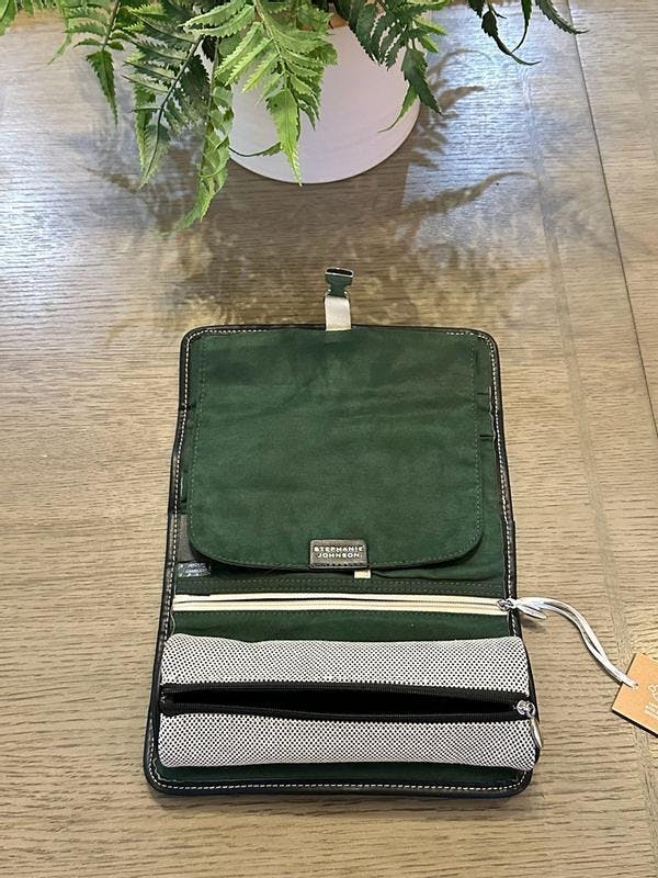 I absolutely love this jewelry roll. It's incredibly functional with separated compartments that make everything feel organized and secure. There's a snap-button rolled zipper pouch for loose pieces three snap buttons for long necklaces with a little bottom pouch to keep them snug and tangle-free and an earring card that holds four pairs with their backings. It also has a roomy pouch for bangles or bracelets and a larger zip pocket behind the rolled pouch. I really appreciate the fabric cover so nothing rubs together when it's rolled up. Every part of this design feels well thought out and I know I'll use it for years. I can't wait to travel with it and finally feel like my jewelry is safe in the cutest holder. The deep green beige and black colors are gorgeous too.